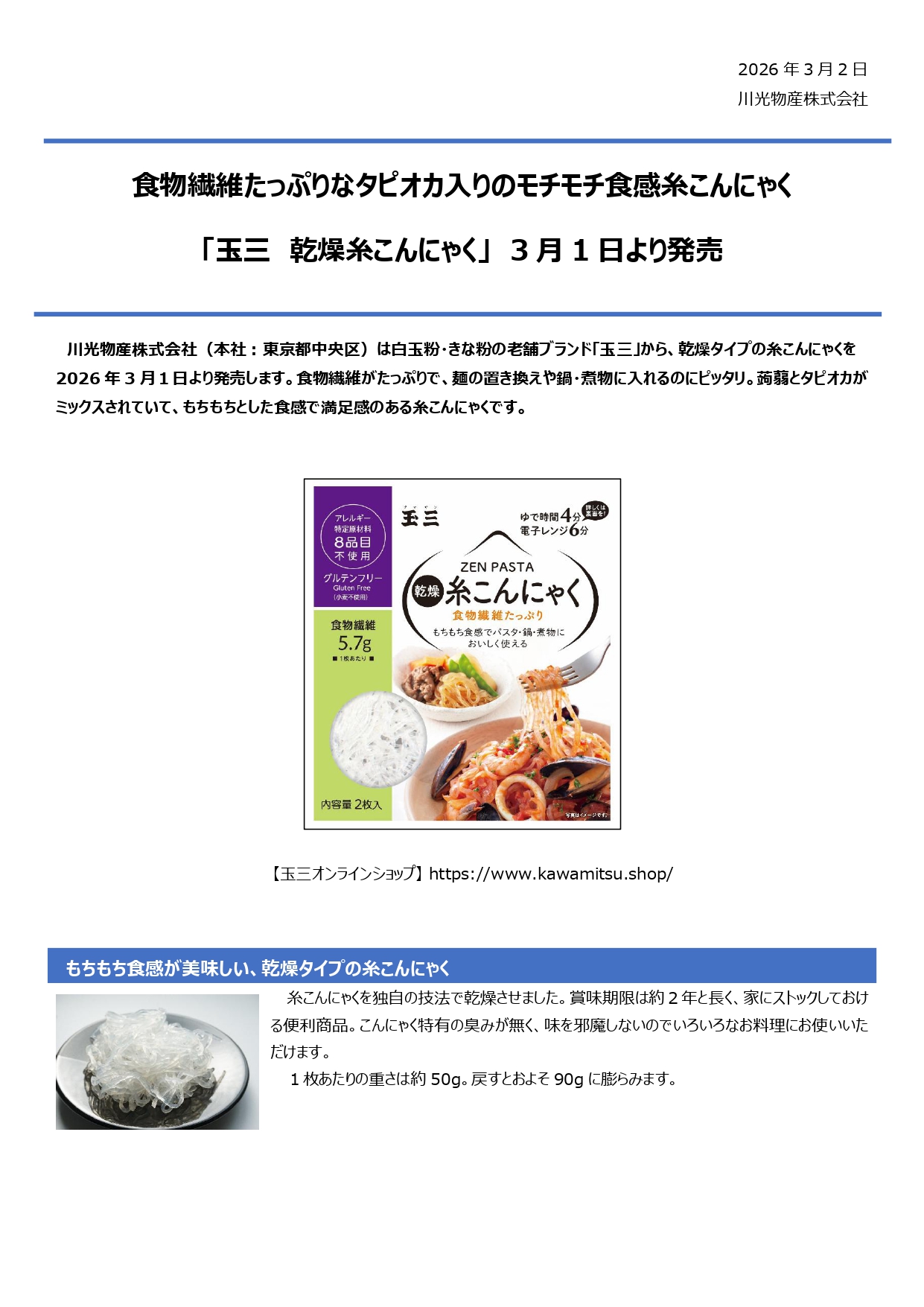 3月より、新商品「玉三 乾燥糸こんにゃく」の販売を開始します。