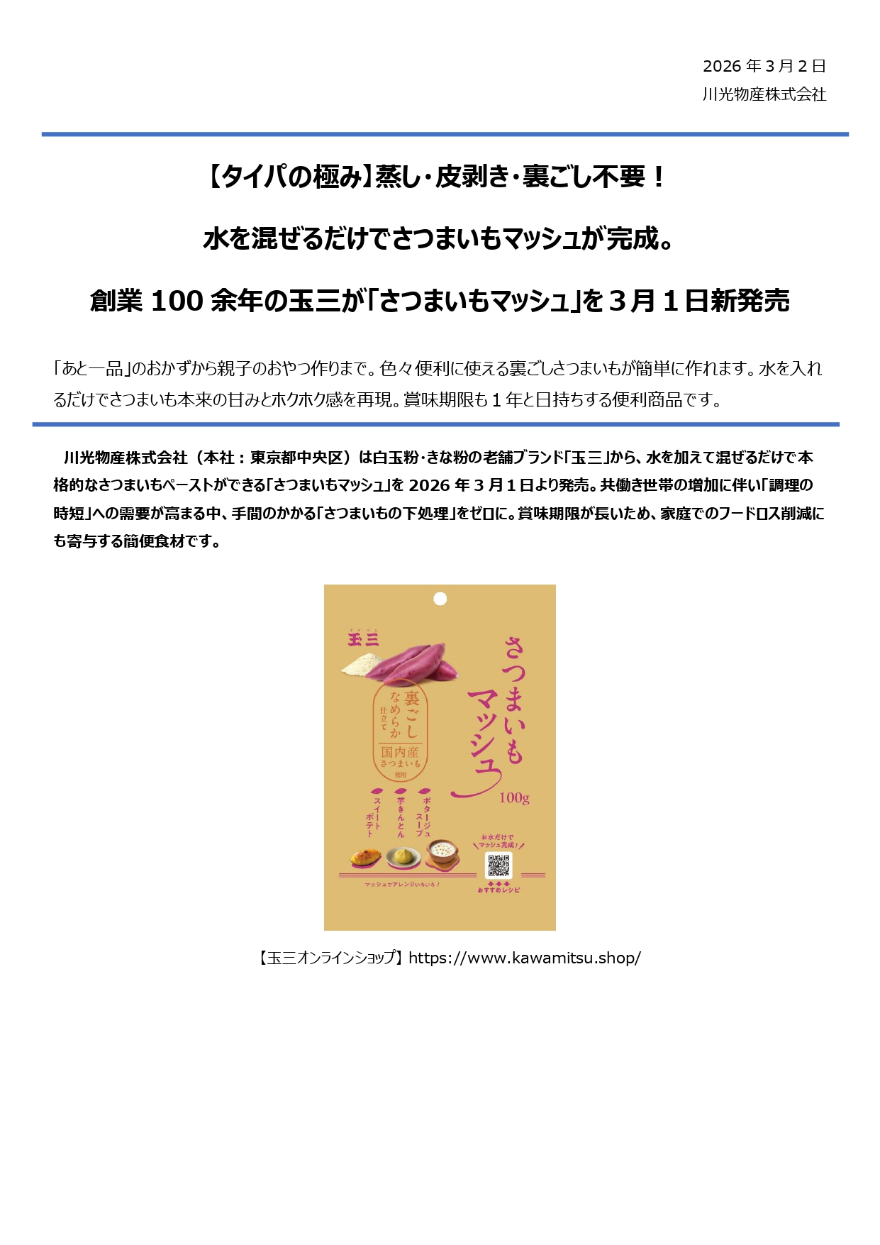3月より、新商品「玉三 さつまいもマッシュ」の販売を開始します。